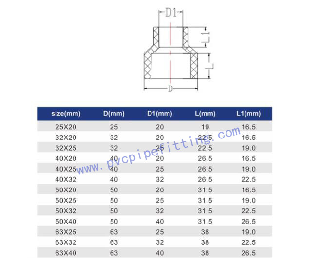 GB pvc fitting reducing coupling for water supply has socket openings on both ends and is suitable for connecting two unthreaded pipes with the same diameter going in the same direction to extend a straight run. The socket ends connect to two different size pipes with a smooth bore for enhanced flow.